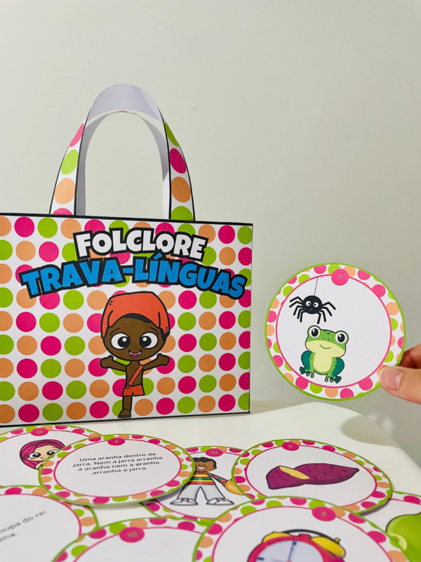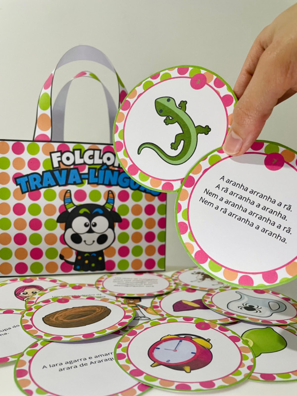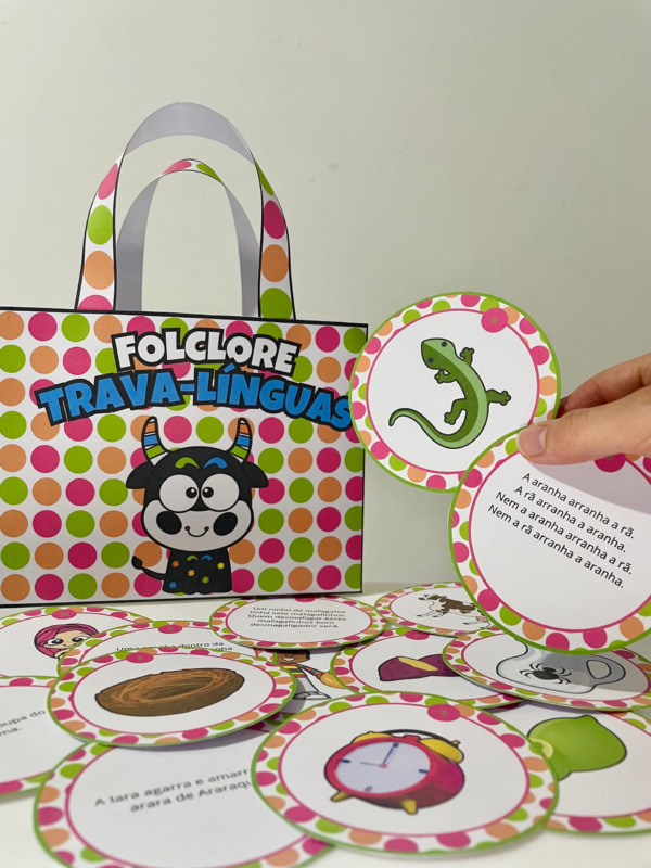Fichas duplas – uma com o trava-língua e outra com a ilustração do personagem folclórico relacionado.